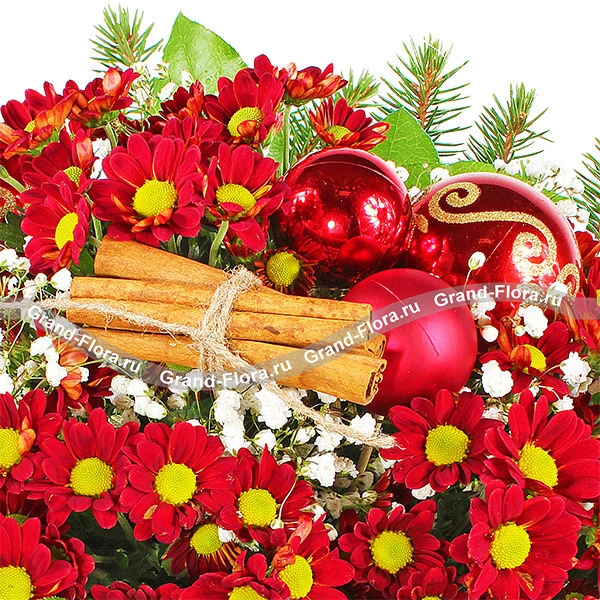 Стандартный (на фото): хризантема красная ромашковидная - 5шт., гипсофила - 4шт., еловая ветвь, корица, новогодний декор и зелень, сетка.